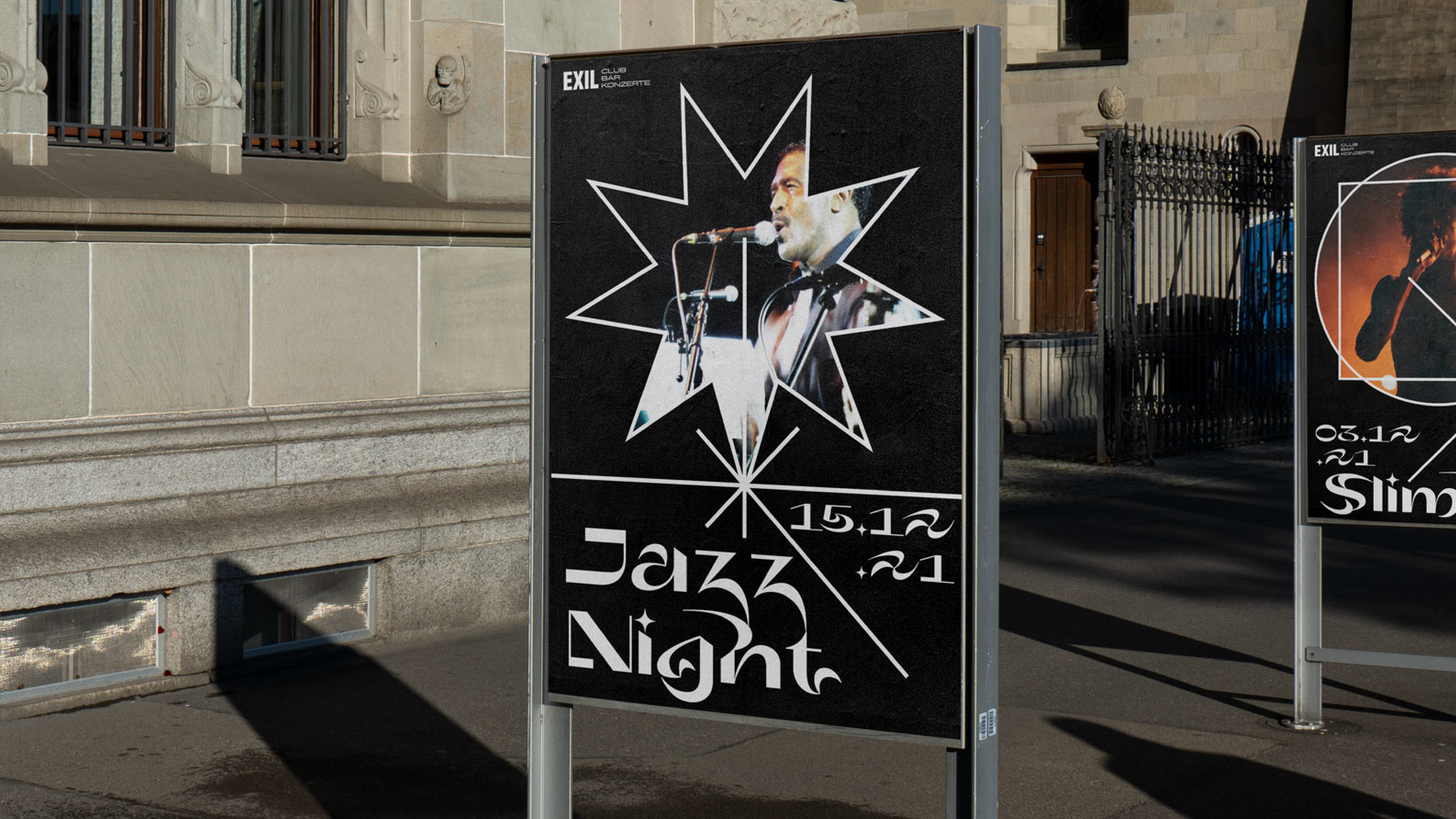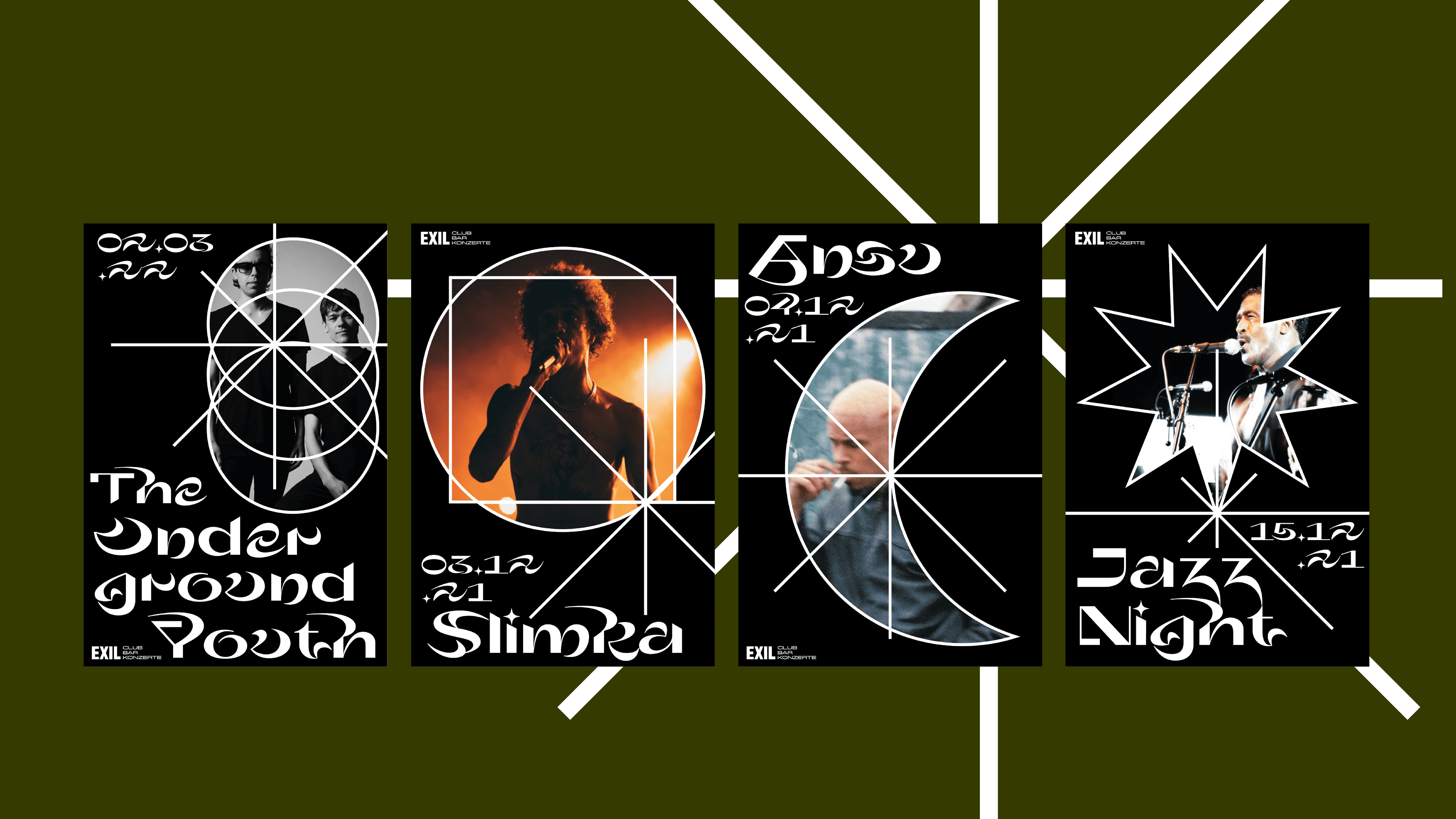 The Exil Club is a versatile event and party location in Zurich. During our marketing and communication module we had the opportunity to create a fictitious redesign and program for the club. Based on the real content I created a bold advertising campaign and the new website. I took the original logo and expanded it. The center of the new look are geometric shapes and patterns that stand for the diverse program and nightlife.